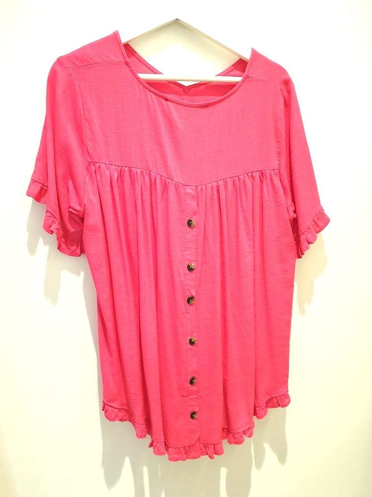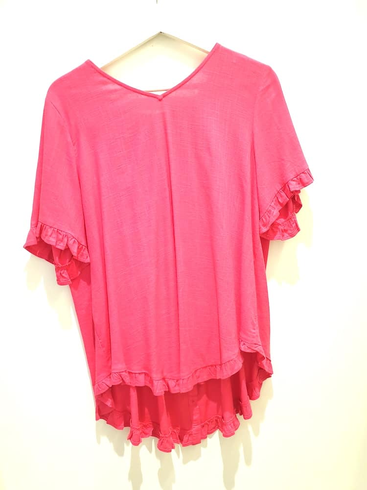 Hot Pink Viscose Linen Blouse With Back Buttons And Frill Bottom